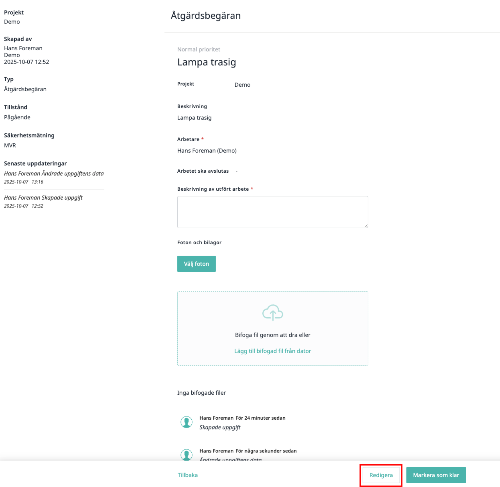 Redigera en åtgärdsbegäran i webbappen