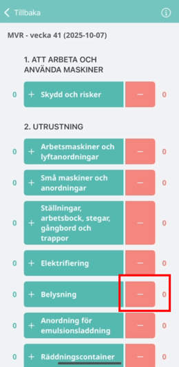 2. För att fylla i en åtgärdsanmärkning, tryck på minusikonen (-) vid den del som behöver åtgärdas.