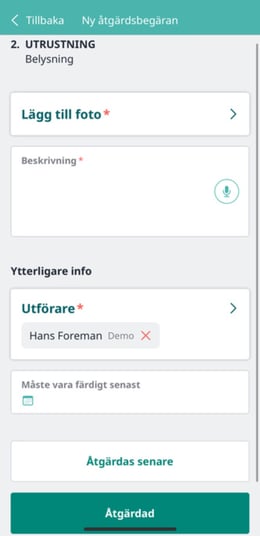 3. Fyll i uppgifterna för åtgärdsanmärkningen och markera om åtgärden har utförts direkt eller ska utföras senare.