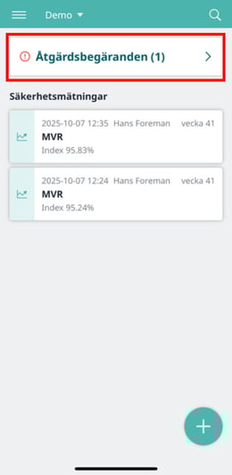 4. Efter att mätningen har slutförts visas pågående åtgärdsbegäranden i mobilappen på sidan Mätningar samt på sidan Uppgifter.