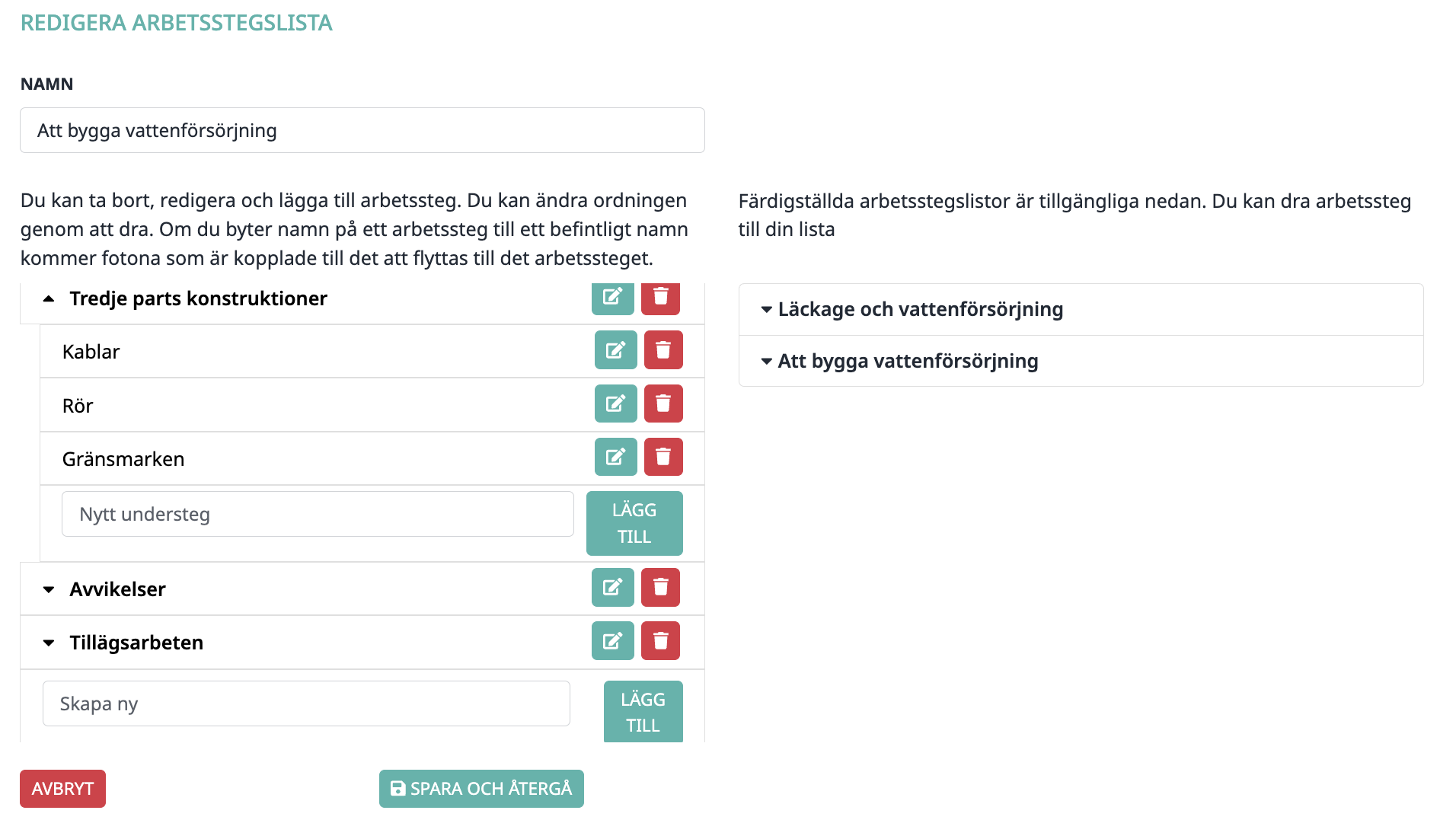 6. Till vänster ser du din egen lista, och till höger ser du färdiga mallar. Du kan dra arbetssteg till din egen lista eller lägga till nya arbetssteg och understeg genom att skriva stegets namn och klicka på ”Lägg till”