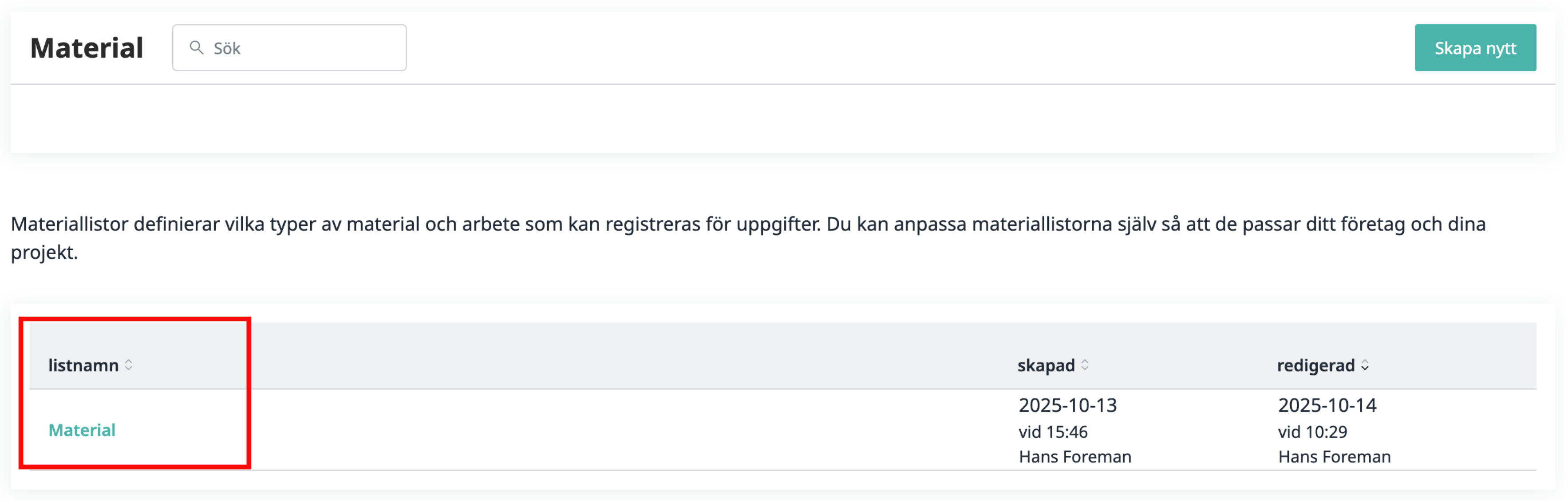 4. Genom att klicka på pennikonen kan du redigera informationen för listan, grupper, undergrupper och material