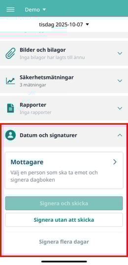 6. I menyn "Datum och signaturer" kan du signera och skicka en eller flera färdigifyllda dagar för signering av den andra parten.