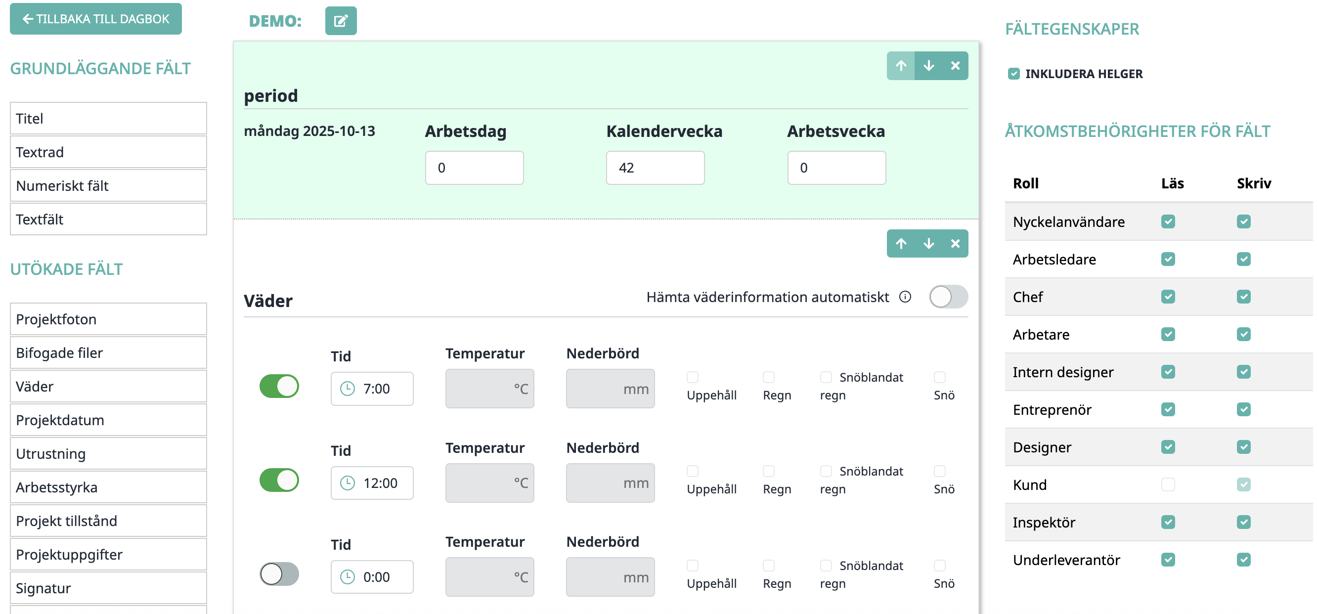 Du kan även redigera dagboken projektspecifikt via projektets redigeringsvy eller direkt på dagbokssidan efter att du valt projektet.