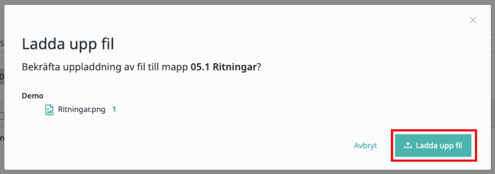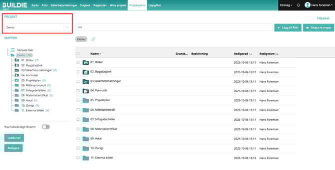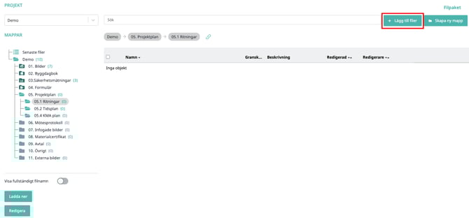 6. Klicka på "Lägg till fil" – därefter visas filen i den valda mappen i projektpärmen.
