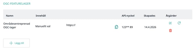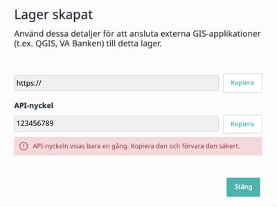 API-nyckeln visas endast en gång, så se till att spara den. Om fönstret stängs innan nyckeln sparats kan du under "Åtgärder" för OGC-lagret klicka på uppdateringsknappen för att skapa en ny nyckel.