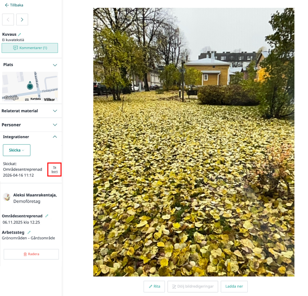 3. Öppna sektionen Integrationer och klicka på "Ta bort" vid OGC-lagret, varefter bilden tas bort från lagret.