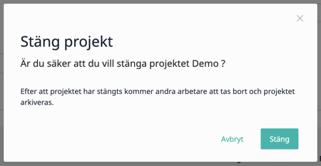 När projektet är färdigt och dokumentationen avslutad kan det arkiveras genom att stängas. Efter stängningen visas projektet inte längre i listorna, och det går inte längre att dokumentera i projektet. Att stänga onödiga projekt gör det enklare att använda systemet, eftersom listorna då endast visar pågående projekt.