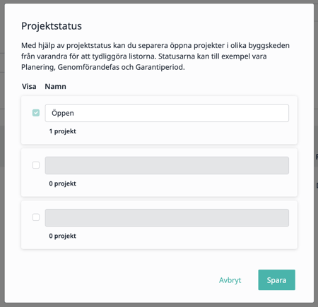 Exempel på statusar kan vara Planering, Genomförandefas och Garantiperiod.