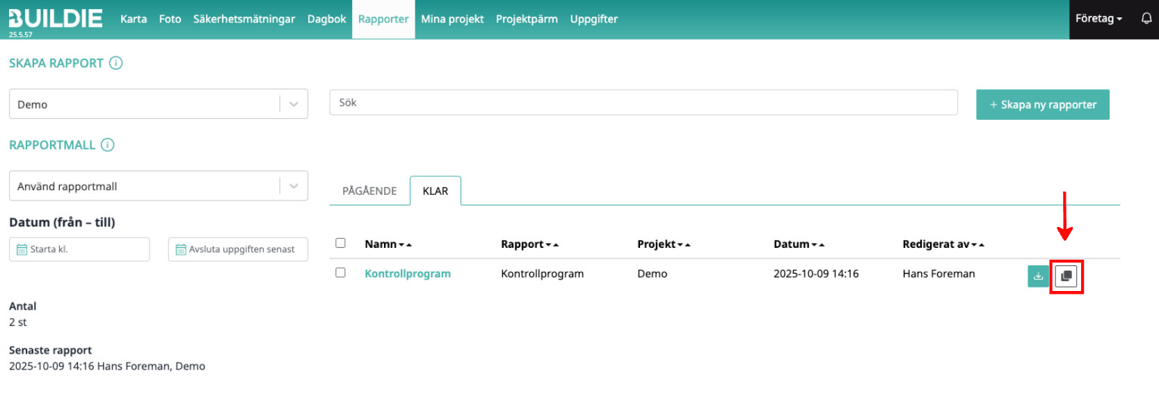 2. När du ser rapporten du vill kopiera, klicka på kopieringsikonen i slutet av rapportens rad.