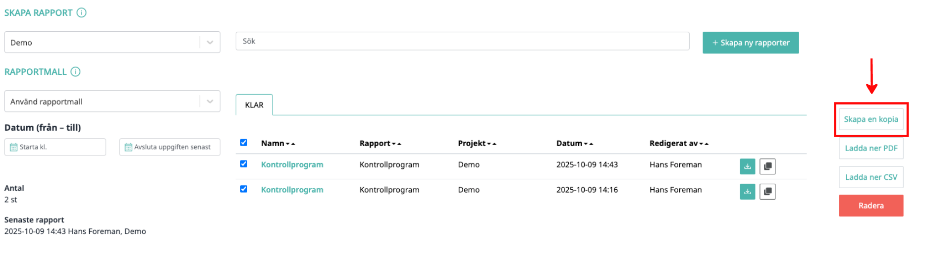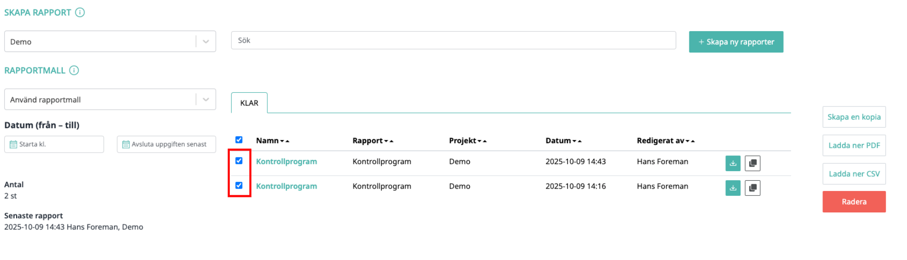 2. Markera de rapporter du vill kopiera genom att klicka i kryssrutorna i början av respektive rad.