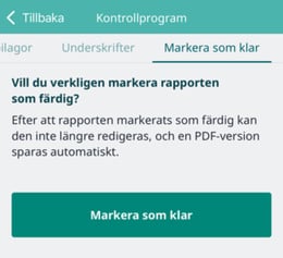 7. För att spara den färdiga rapporten markerar du den som klar i det sista avsnittet genom att trycka på "Markera som klar", varefter rapporten flyttas till fliken "Klar".