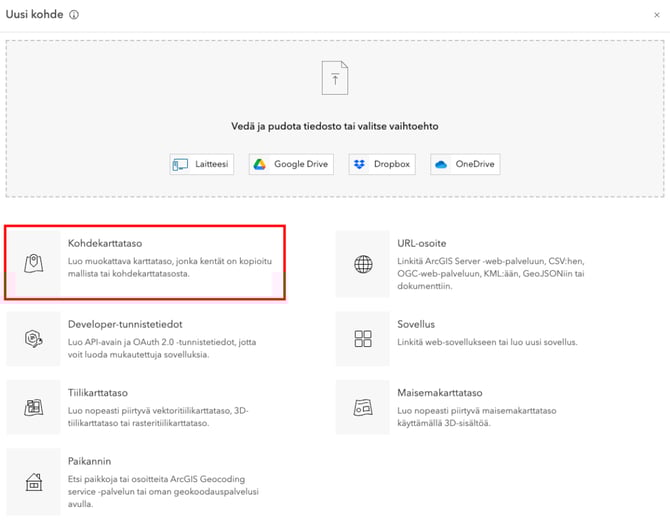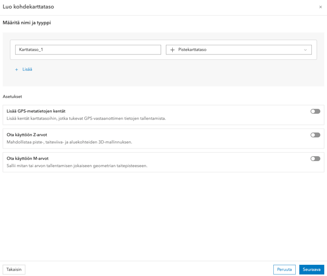 Esri luo oletuskarttatason automaattisesti. Älä nimeä sitä uudelleen, vaan jatka seuraavaan vaiheeseen muuttamatta mitään valintoja.