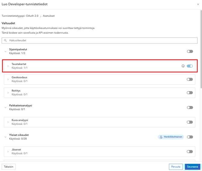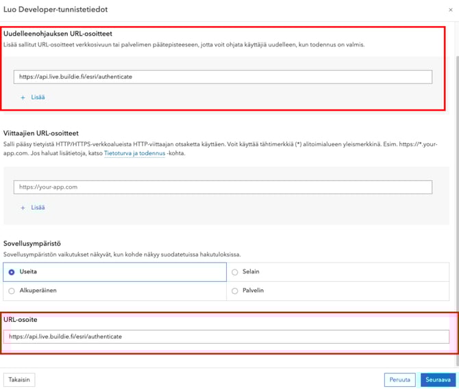Client Secret: löytyy samasta paikasta Esristä, OAuth-tunnistetiedot -tason alta.