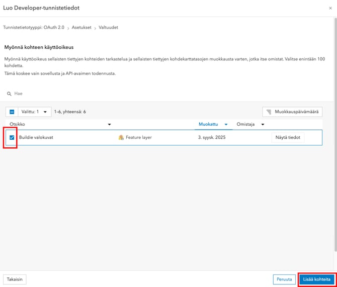 12. Määritä oikeudet ja klikkaa "Lisää kohteet"