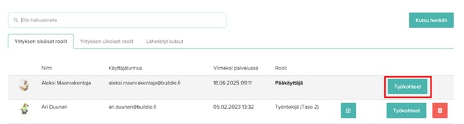 Jos henkilö on yrityksen ulkoisessa roolissa, tallennuksen jälkeen voi vielä muokata työkohdekohtaisia oikeuksia toimintoihin.