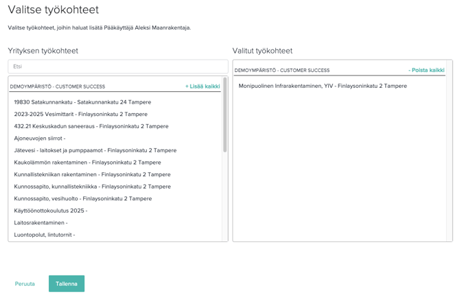 4. Valitse henkilölle näkyvät työkohteet ja "Tallenna".