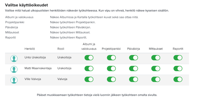 7. Valitse vielä yrityksen ulkoisille käyttäjille työkohdekohtaiset oikeudet