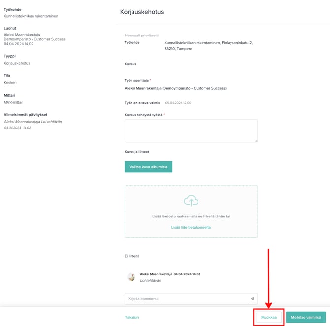Korjauskehotuksen muokkaaminen web-sovelluksessa
