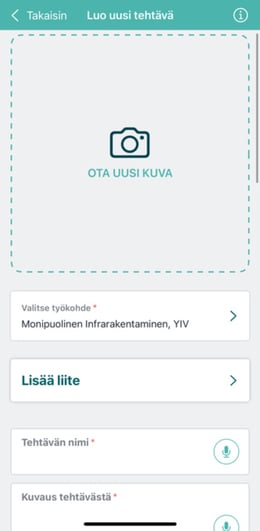 Luo uusi tehtävä -toiminto saattaa löytyä myös Kamera-sivulta, jos se on asetuksista otettu käyttöön.