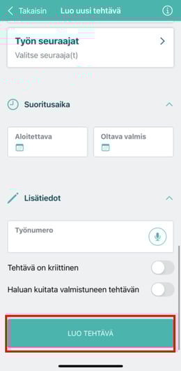4. Paina lopuksi sivun alaosasta "Luo tehtävä", jonka jälkeen työn suorittajiksi merkityille henkilöille lähtee ilmoitus tehtävästä.