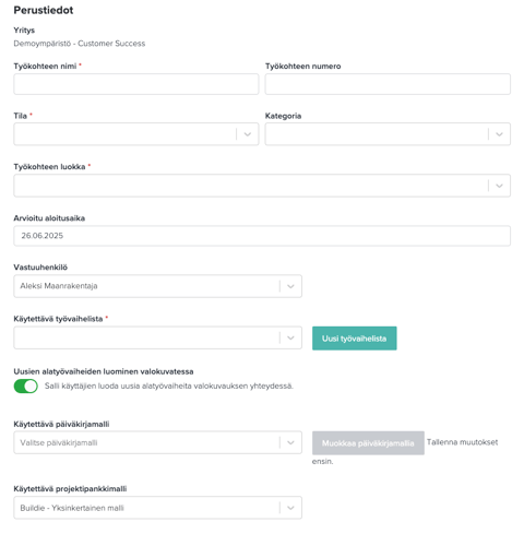 4. Täytä työkohteen perustiedot ja valitse käytettävät mallit