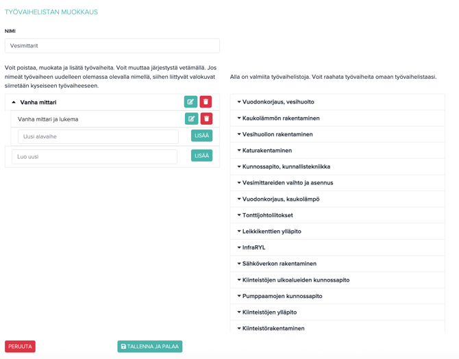 6. Vasemmalla näet oman työvaihelistasi ja oikealla valmiita listamalleja. Voit siirtää työvaiheita omaan listaasi tai lisätä työvaiheita ja alavaiheita itse kirjoittamalla vaiheen nimen ja klikkaamalla "Lisää"