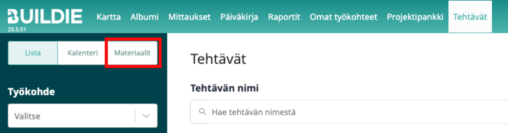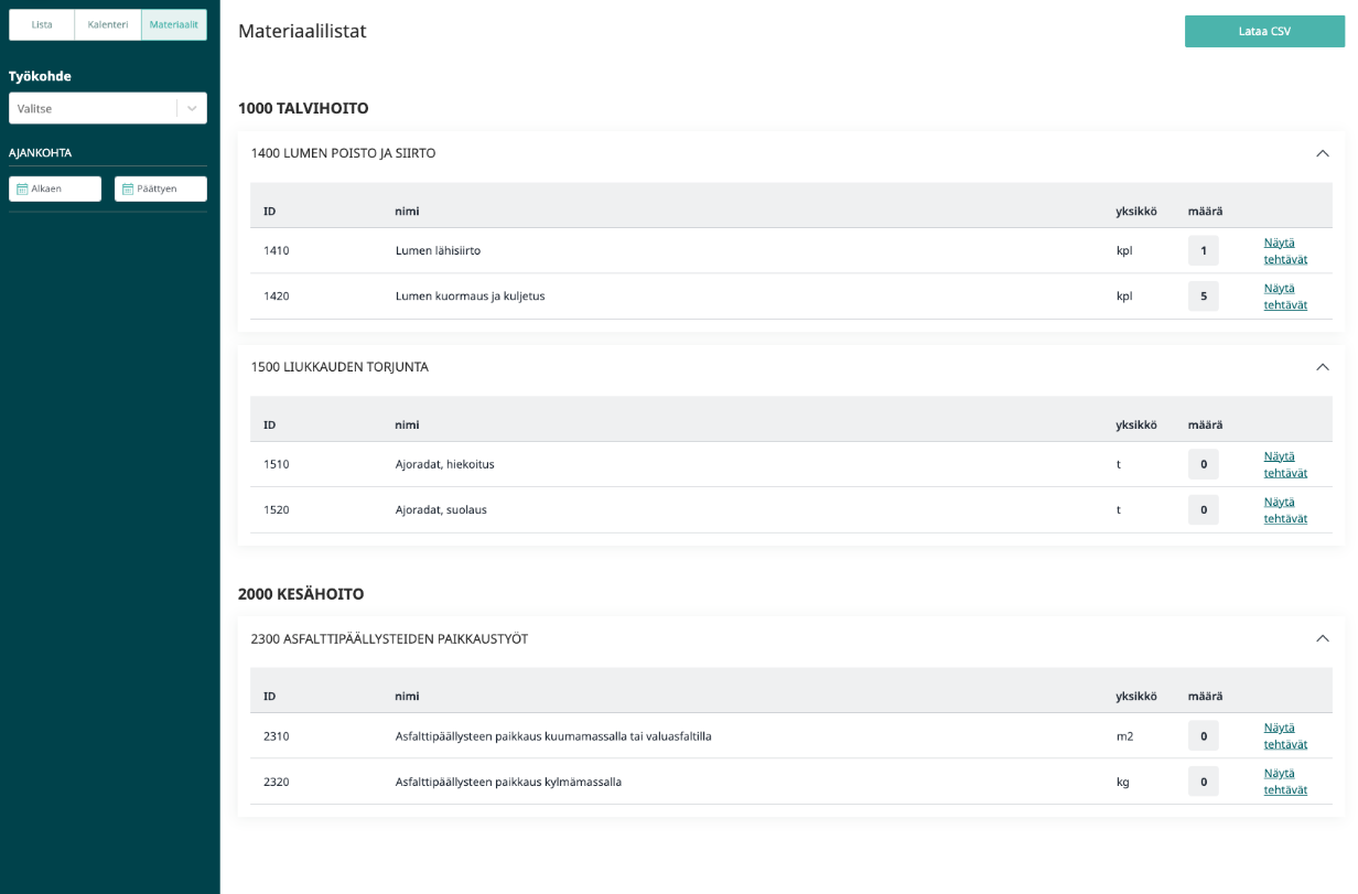 Voit suodattaa materiaalilistoja työkohteen ja ajanjakson perusteella. Klikkaamalla "Näytä tehtävät" siirryt tehtävien luettelonäkymään, jossa näkyvät kaikki tehtävät, joissa kyseistä materiaalia on käytetty.