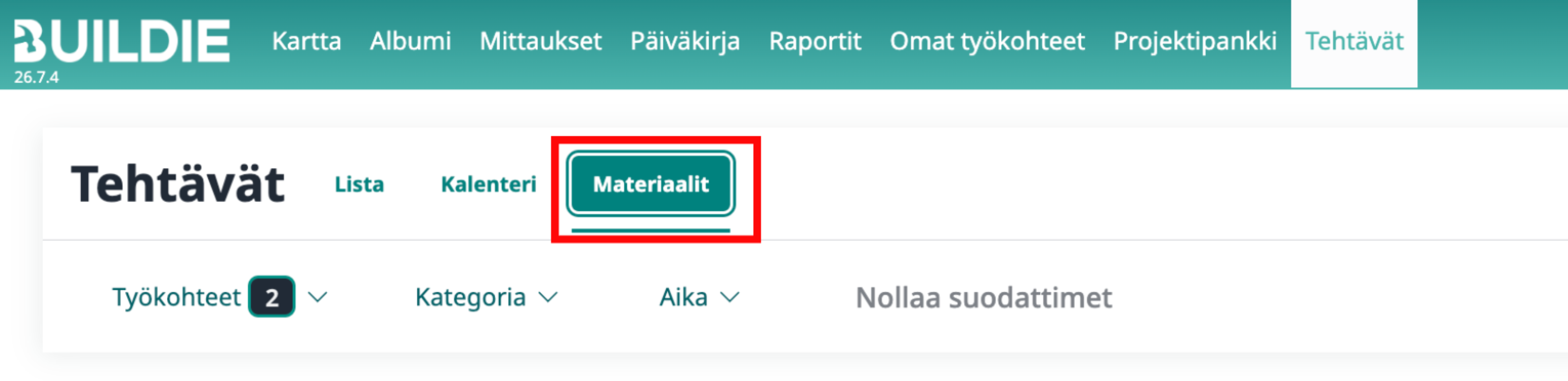 2. Klikkaa suodatuspalkin välilehteä "Materiaalit"