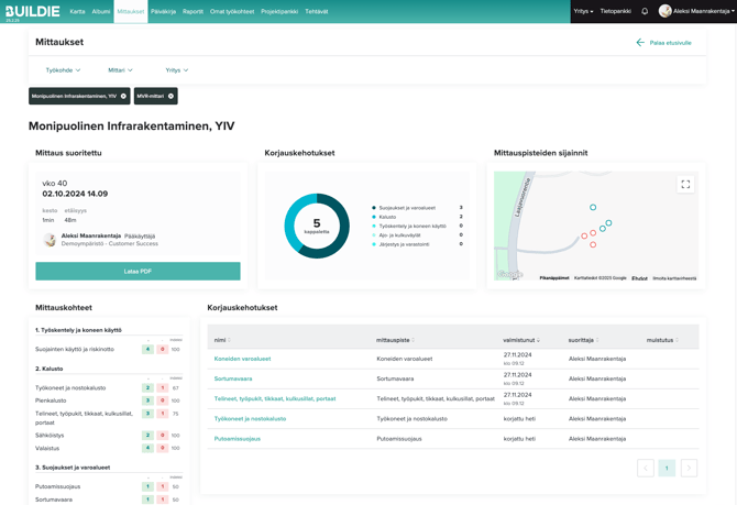 Yksittäisen mittauksen näkymään pääset klikkaamalla "Mittaukset"-luettelosta työkohteen nimeä.