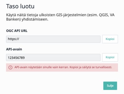 API-avain näytetään vain kerran, joten ota tämä talteen. Mikäli ikkuna suljetaan ennen avaimen talteen ottoa, voit OGC-tason "Toiminnot" kohdasta klikata päivityspainiketta jolla saat luotua uuden avaimen.