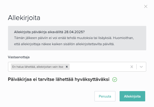 Jos päiväkirjan allekirjoitusosiossa ei ole määritetty useampaa allekirjoittajaa, riittää valinnaksi "En halua lähettää, allekirjoitan vain itse".