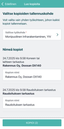 5. Valitse mille työkohteelle raportit tallennetaan, nimeä haluamaksesi sekä paina lopuksi "Kopioi".