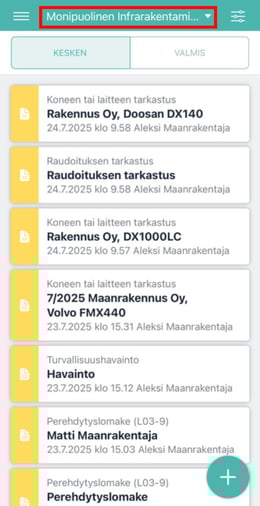 3. Valitse yläosasta työkohde painamalla, jolloin aukeaa valittavien työkohteiden lista