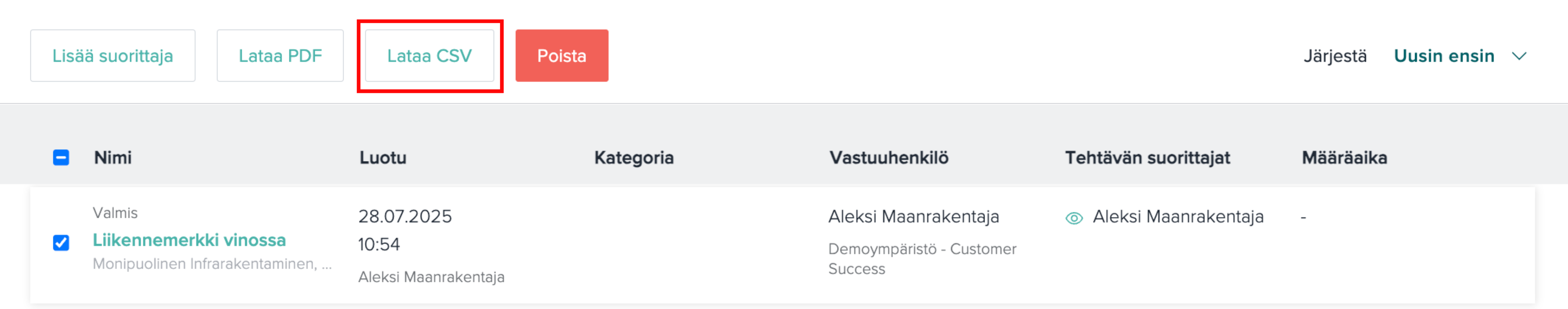 28. elokuuta 2025 Tehtävien CSV-vienti 1. Avaa yläpalkista "Tehtävät" 2. Valitse haluamasi tehtävät niiden edessä olevan valintaruudun avulla 3. Klikkaa "Lataa CSV" 4. Tiedostot latautuvat laitteellesi