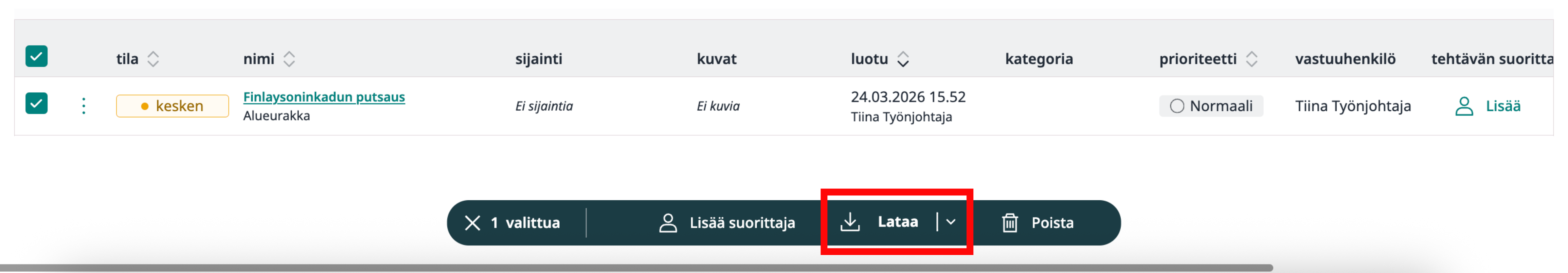 3. Klikkaa "Lataa" ja valitse ladattavaksi joko kaikki valintaruudulla merkityt tehtävät tai kaikki hakutuloksen tehtävät