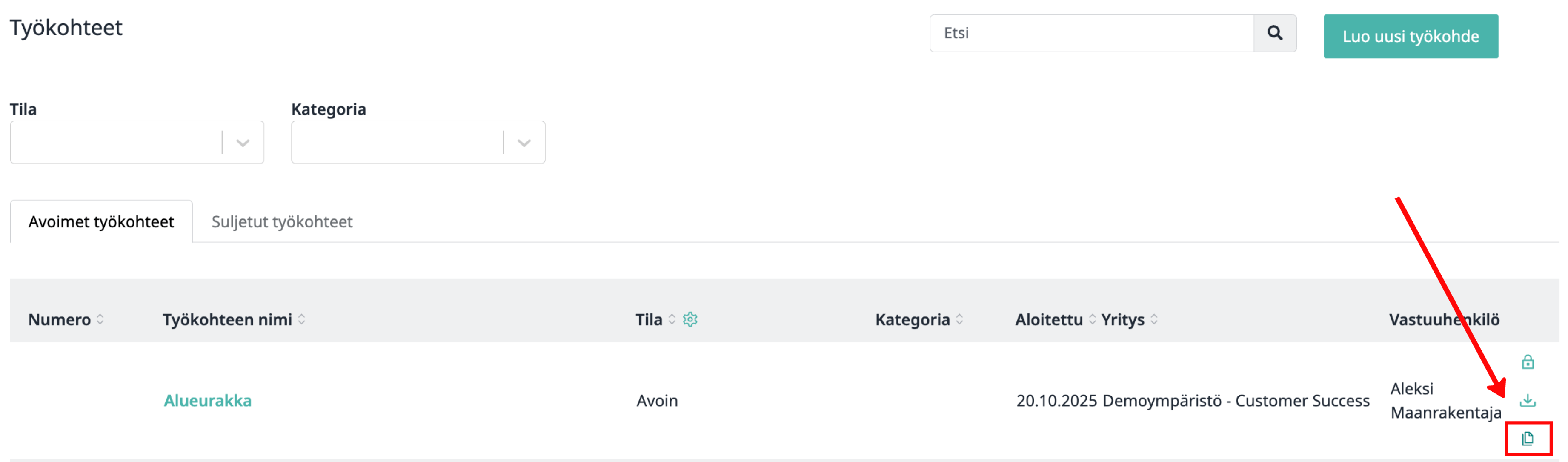 3. Klikkaa työkohteen riviltä kopiointikuvaketta.