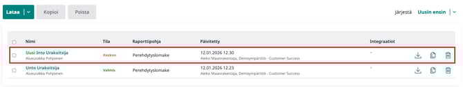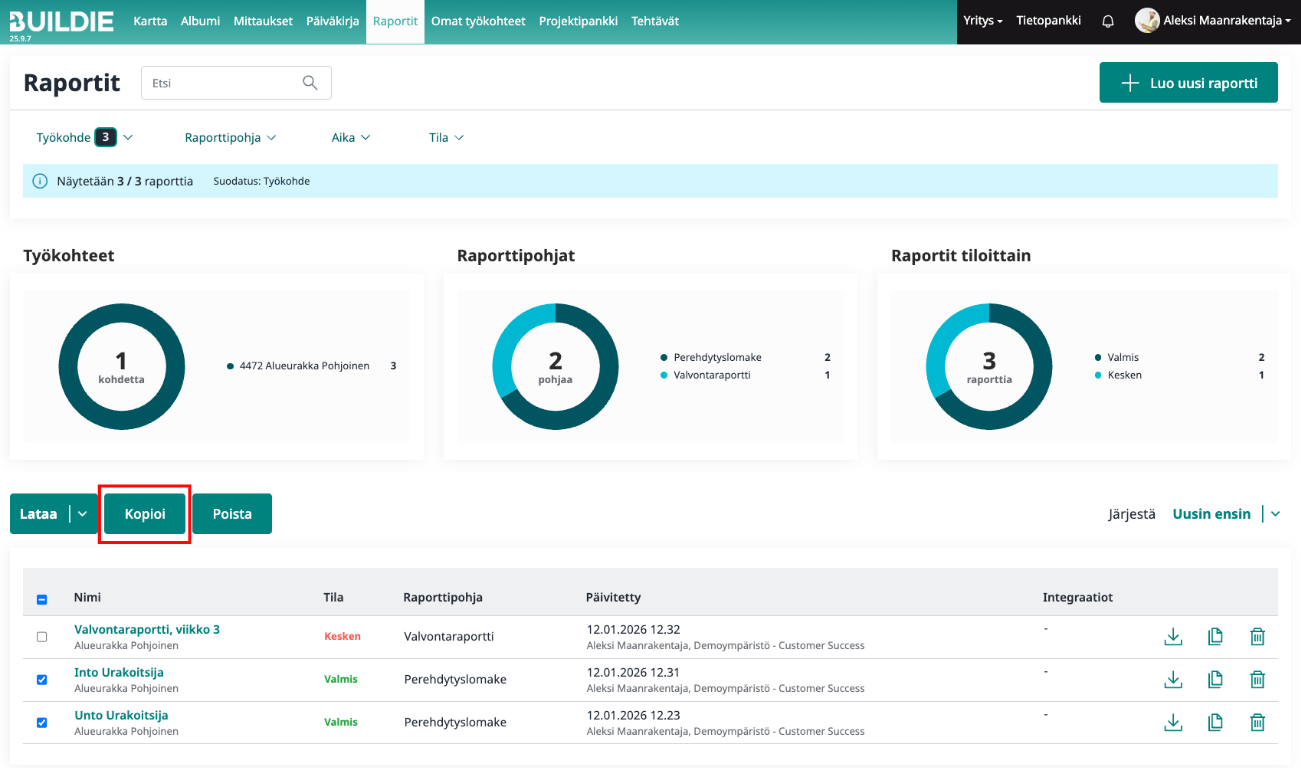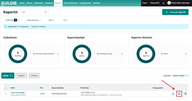 4. Klikkaa "Kopioi", jonka jälkeen pääset täyttämään keskeneräistä raporttia klikkaamalla sitä listalta. Raportissa ovat valmiiksi kopioituna raportin pohjatiedot pl. liitteet ja allekirjoitukset.