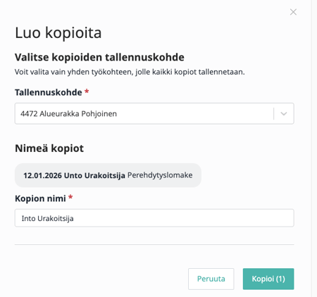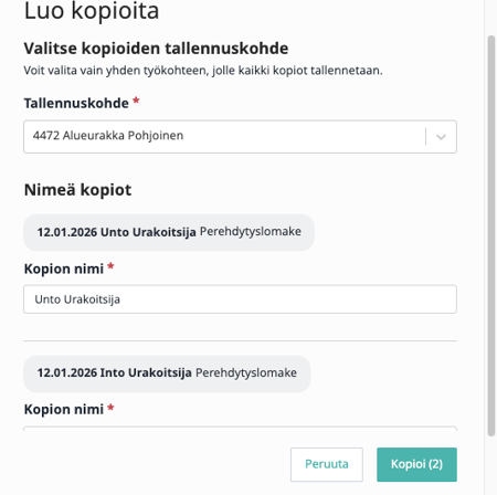 4. Valitse mille työkohteelle kopiot lisätään ja nimeä ne