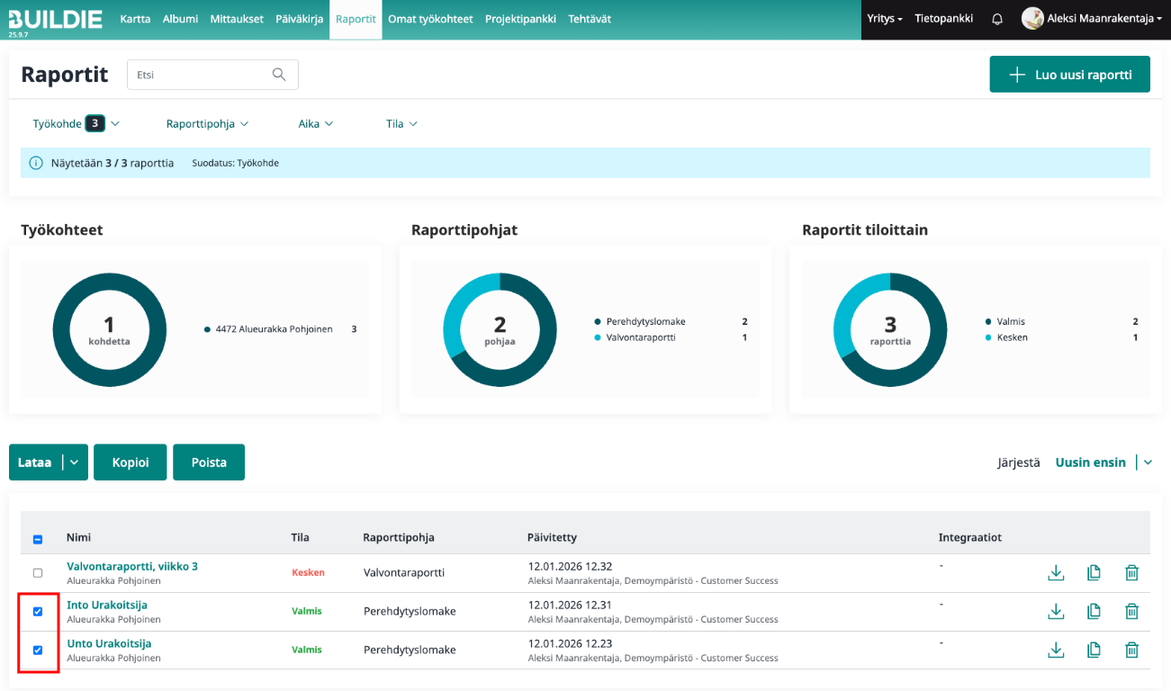 2. Valitse kopioitavia raportteja rivien alussa sijaitsevasta valintaruudusta