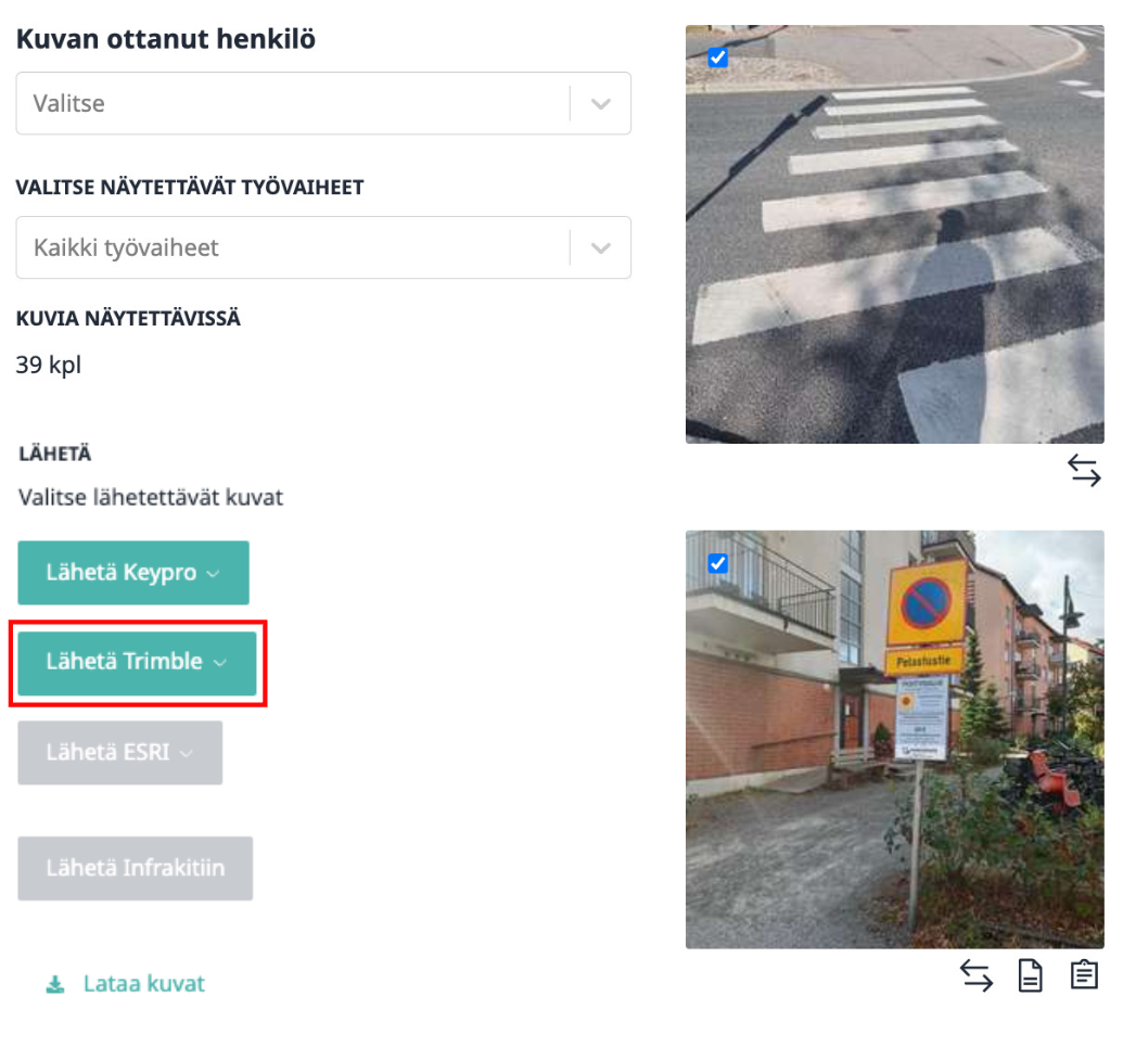 2. Valitse lähetettävät valokuvat niiden kulmassa sijaitsevasta valintaruudusta ja klikkaa "Lähetä Trimble".