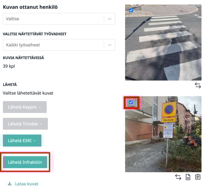 2. Valitse lähetettävät valokuvat niiden kulmassa sijaitsevasta valintaruudusta ja klikkaa "Lähetä Infrakitiin"