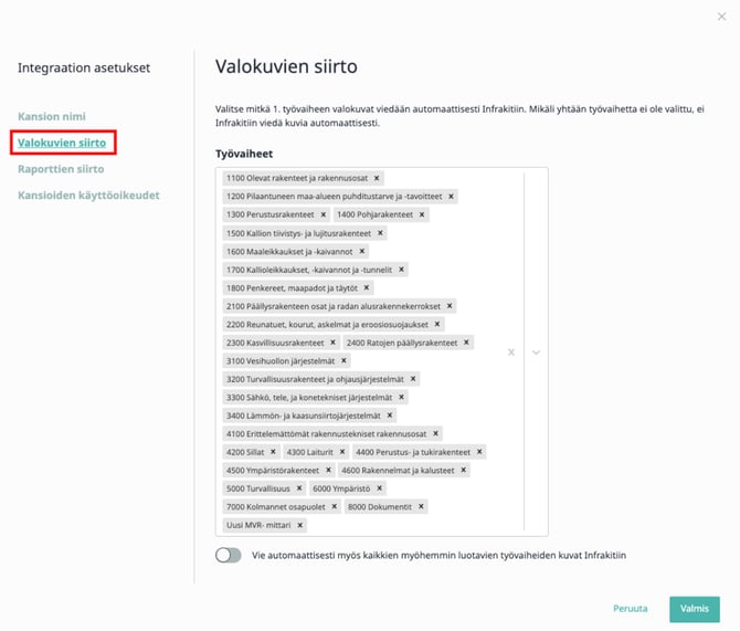 4. Valitse "Valokuvien siirto" ja lisää tai poista työvaiheita sen mukaan, minkä työvaiheen valokuvia työkohteesta lähetetään automaattisesti Infrakitiin